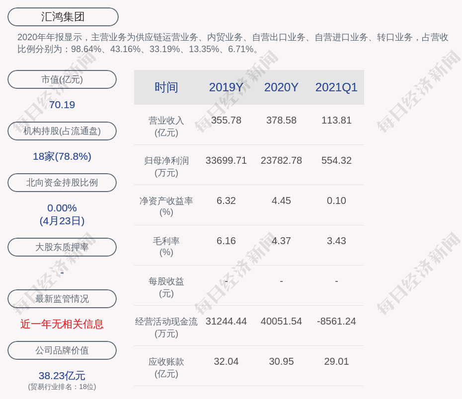 2020年年報顯示,匯鴻集團的主營業(yè)務為供應鏈運營業(yè)務、內貿業(yè)務、自營出口業(yè)務、自營進口業(yè)務、轉口業(yè)務,占營收比例分別為:98.64%、43.16%、33.19%、13.35%、6.71%。