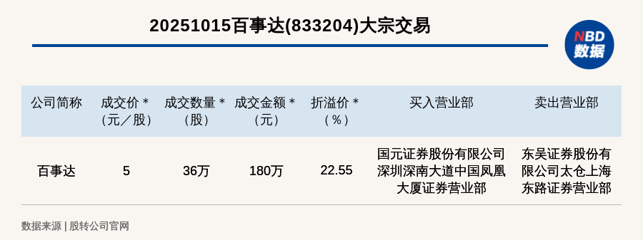 每經(jīng)訊,2025年10月15日,新三板創(chuàng)新層公司百事達(833204,收盤價:4.08元)發(fā)生一筆大宗交易,成交價5元/股,成交數(shù)量36萬股,成交金額180萬元,溢價22.55%。買入營業(yè)部是國元證券股份有限公司深圳深南大道中國鳳凰大廈證券營業(yè)部,賣出營業(yè)部是東吳證券股份有限公司太倉上海東路證券營業(yè)部。