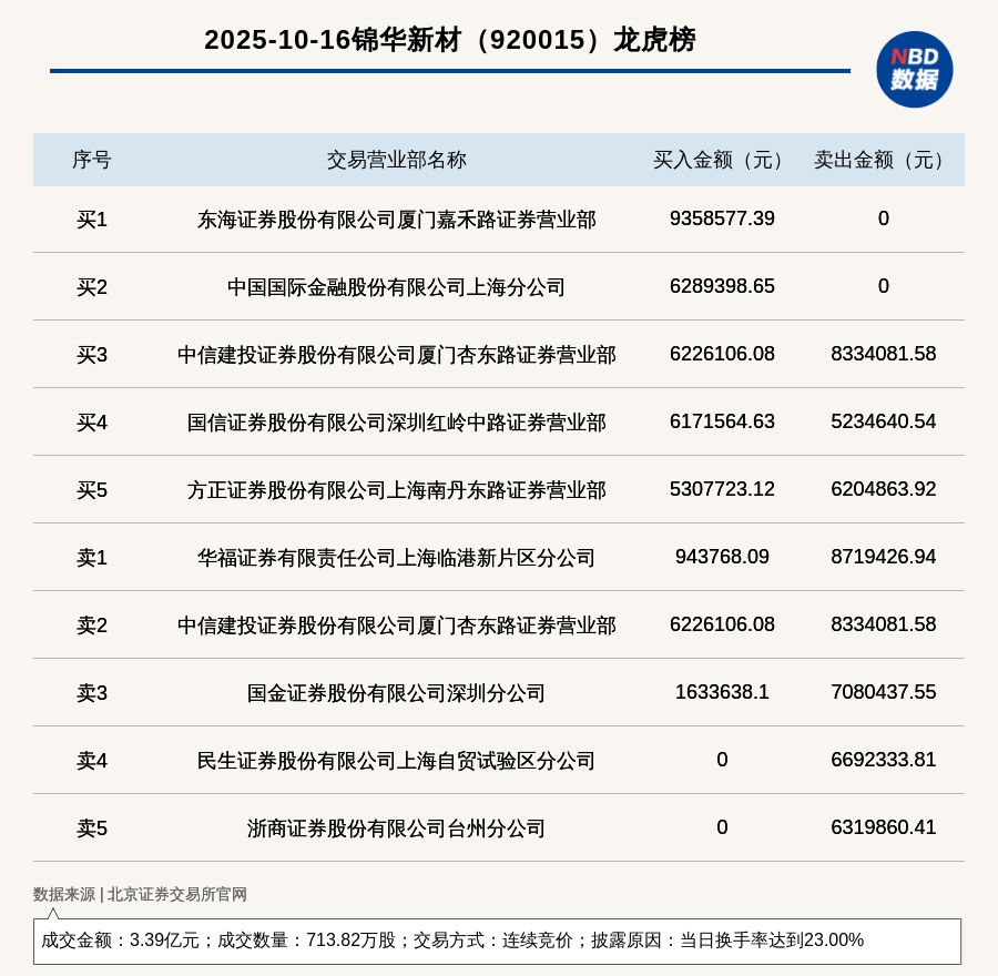 每經(jīng)訊,2025年10月16日,北交所上市公司錦華新材(920015,收盤(pán)價(jià):46.9元)登上龍虎榜,交易方式是連續(xù)競(jìng)價(jià),披露原因是當(dāng)日換手率達(dá)到23.00%,成交數(shù)量713.82萬(wàn)股,成交金額3.39億元。買(mǎi)一席位為東海證券股份有限公司廈門(mén)嘉禾路證券營(yíng)業(yè)部,買(mǎi)入935.86萬(wàn)元;賣(mài)一席位為華福證券有限責(zé)任公司上海臨港新片區(qū)分公司,賣(mài)出871.94萬(wàn)元。
